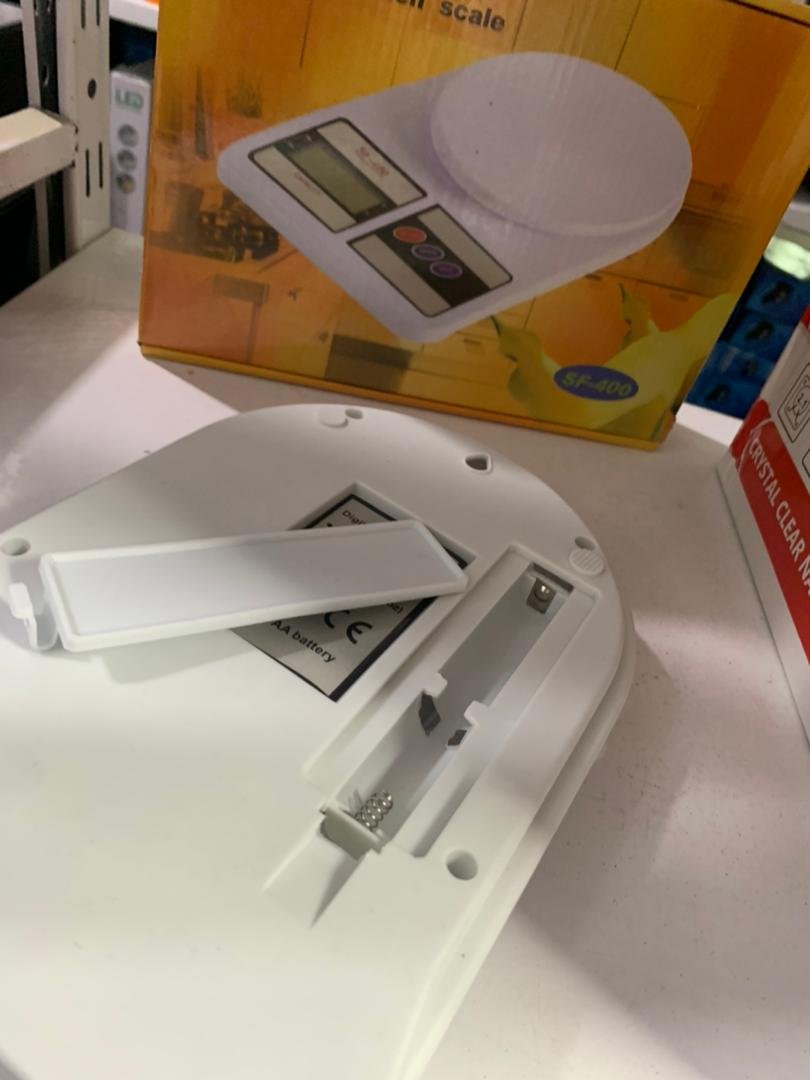 ميزان إلكتروني SF-400السعة: 1 كغ / 5 كغ / 10 كغ، الدقة: 1 غرام.الخامة: بلاستيك ABS.أزرار لمسية، وحدات القياس: g، lb، oz.شاشة LCD بحجم 45×21 ملم.يعمل ببطاريتين AAA (غير مرفقة مع العبوة).الأبعاد: المنتج 24×17 سم، قطر الصحن 14.8 سم.الوزن: 420 غرام (مع التغليف).نظام 4 حساسات عالية الدقة.مؤشر حمل زائد ومؤشر انخفاض البطارية.خاصية الإيقاف التلقائي والتصفير التلقائي.مصنوع من البلاستيك والإلكترونيات مع صحن من الفولاذ المقاوم للصدأ.العبوة تحتوي على ميزان إلكتروني واحد.
