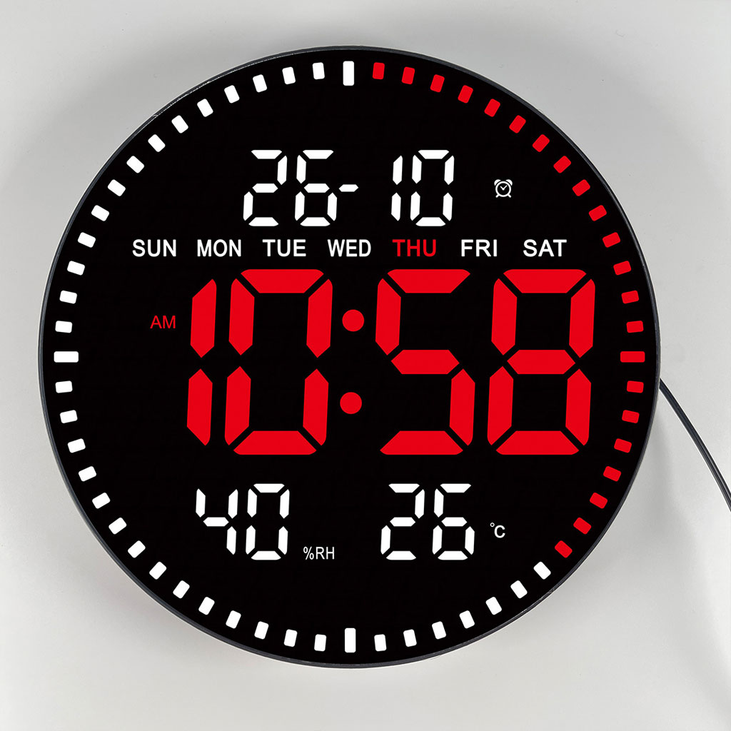 ساعة حائط رقمية LED:المواصفات:تصميم دائري عصري بحجم 28.5 × 28.5 × 3 سم.هيكل أسود مع إضاءة بألوان متعددة: أحمر، أخضر، أزرق، أبيض.مزودة بجهاز تحكم عن بعد ووظيفة منبه.شروط الاستبدال:ضمان استرجاع لمدة 30 يومًا في حالة وجود عيوب مصنعية.يجب أن يكون المنتج بحالته الأصلية ومغلقًا. (لا يُقبل المرتجع إذا كان مفتوحًا أو مستخدمًا أو تالفًا).