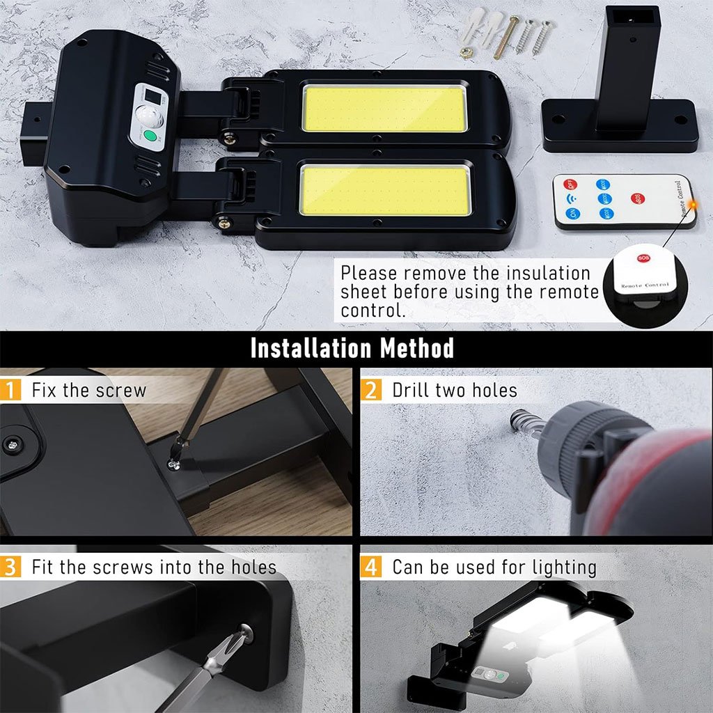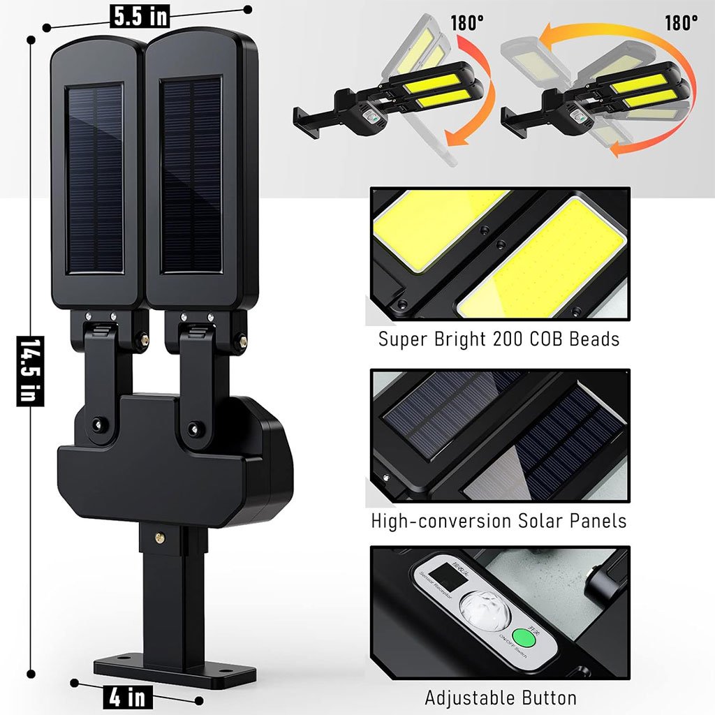 مصابيح شمسية فائقة السطوع – مصنوعة من ABS + PC عالي الجودة، مزودة بـ 200 حبة LED لتوفير إضاءة قوية لمساحات واسعة مع استهلاك منخفض للطاقة. 3 أوضاع إضاءة + تحكم عن بعد –الوضع 1: إضاءة عالية عند استشعار الحركة، ثم متوسطة بعد 20 ثانية.الوضع 2: إضاءة عالية عند استشعار الحركة، ثم إيقاف بعد 20 ثانية.الوضع 3: إضاءة مستمرة في الظلام. رأس إضاءة قابل للتعديل + زاوية واسعة – دوران عمودي حتى 90° وأفقي حتى 180° لتغطية أكبر. مقاومة للماء IP65 – تتحمل الظروف الجوية القاسية مع شحن شمسي من 6 إلى 8 ساعات لعمل يصل إلى 10 ساعات. تركيب سهل – يمكن تثبيتها مباشرة على الجدار أو العمود باستخدام البراغي المرفقة.