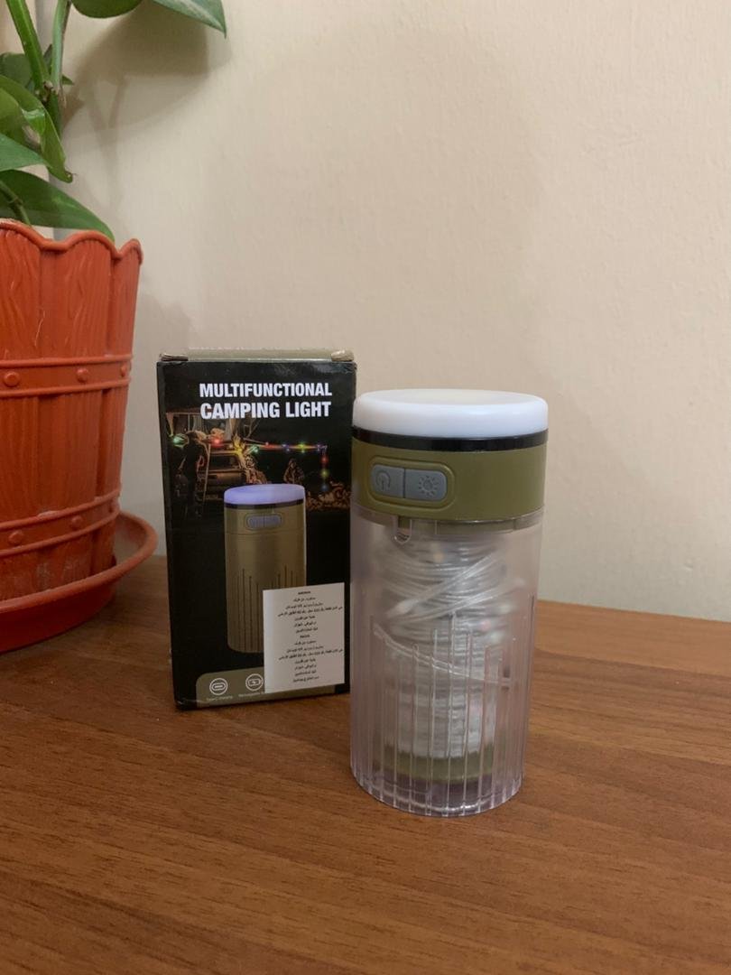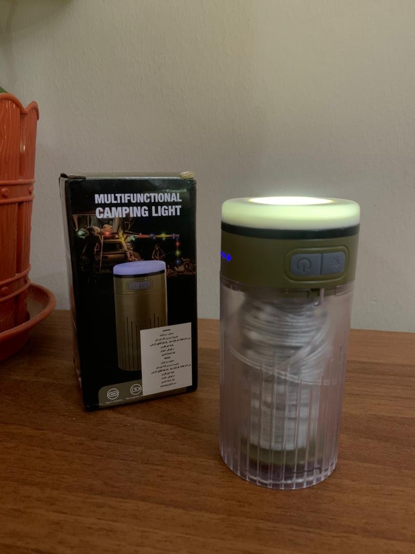 🔦 مصباح تخييم محمول مع سلسلة إضاءة 10 متر – أجواء ساحرة في أي مكان! 🌲🌙استمتع بتجربة تخييم متكاملة مع هذا المصباح الذكي المزود بسلسلة أضواء بطول 10 مترًا، مصمم لتوفير الإضاءة المثالية سواء داخل الخيمة أو في الهواء الطلق، كما يُضفي لمسة جمالية على أجواء السهرات والمناسبات العائلية.✅ المميزات:مصباح تخييم متعدد الوظائف مصمم بتقنية LED ويحتوي على سلسلة إضاءة مرنة بطول 10 مترًا، سهلة التخزين والتركيب، تضيف أجواءً رومانسية وهادئة في كل مكان.9 أوضاع إضاءة متنوعة للمصباح ✨ ضوء أبيض (قوي / منخفض) 🔦 شعاع طويل المدى (قوي / منخفض) 🌈 وضع ألوان RGB المتغير4 أوضاع إضاءة للسلسلة الضوئية 💡 ضوء قوي – منخفض – تنفس – وميض مثالية لمناسبات مثل التخييم، السهرات، الزينة الليلية أو ديكور الفناء.بطارية قوية قابلة لإعادة الشحن بطارية بسعة 2200 مللي أمبير، قابلة للشحن عن طريق كابل Type-C (مرفق)، وتعمل ما بين 4.5 حتى 30 ساعة حسب وضع الإضاءة. كما يمكن استخدامها كبنك طاقة لشحن هاتفك في حالات الطوارئ!مصنوعة من مواد عالية الجودة مواد مقاومة ومتينة (ABS + PC + سيليكون)، مقاومة للماء بمعيار IPX4 للاستخدام في الأيام الممطرة أو الظروف الرطبة.📦 محتويات العلبة:مصباح تخييم + سلسلة ضوئية 10 مكابل شحن Type-Cقاعدة تثبيت📐 المواصفات الفنية:السعة: 2200 مللي أمبيروقت الشحن: 2.5 – 3 ساعاتمدة التشغيل: من 4.5 إلى 30 ساعةالطول الكلي للسلسلة: 15 متردرجة مقاومة الماء: IPX4الحجم: 5.4 × 21 سم