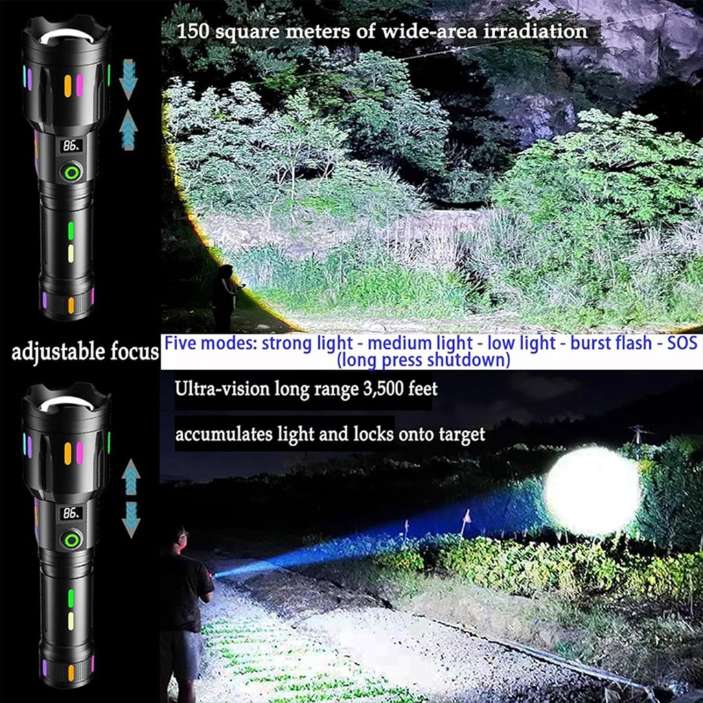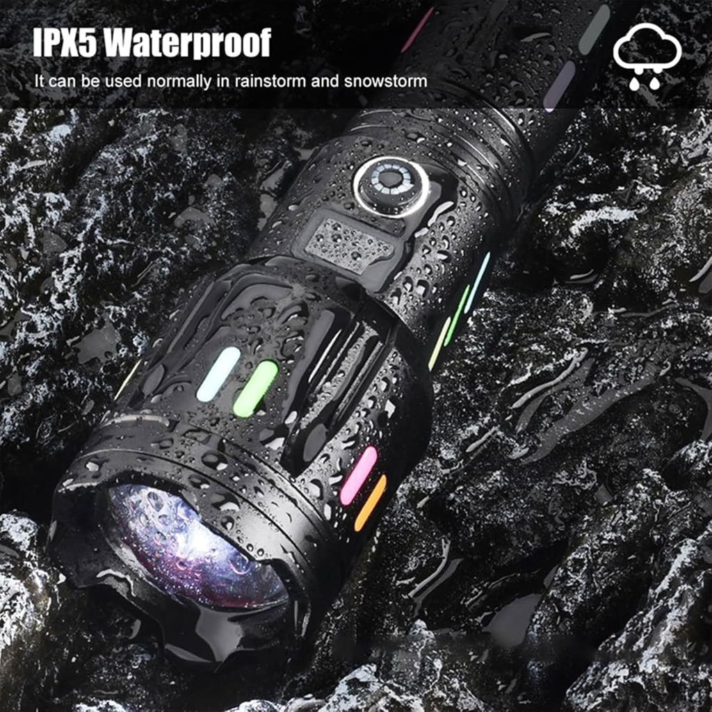 Puces LED 30 W : puces à technologie améliorée, pouvant émettre jusqu’à 150 000 lumens, soit 20 fois plus lumineux qu’une lampe de poche ordinaire. Elle peut facilement éclairer une pièce de 2500 pieds carrés ou se concentrer sur des objets jusqu’à 2800 pieds de distance5 modes d’éclairage : fort, moyen, faible, stroboscopique et SOS. Vous pouvez l’utiliser de manière flexible dans différents scénarios. Le corps est antidérapant, bouton en silicone, appuyez profondément pendant 2 à 3 secondes sous n’importe quel mode pour éteindre sans parcourir tous les modesFonction zoom télescopique : effectuez un zoom arrière ou avant sur la tête de la lampe de poche pour passer en mode projecteur et en mode projecteur. Le mode projecteur convient à l’observation à longue portée et le mode projecteur convient à l’éclairage de grandes surfaces, ce qui est très pratiqueÉclairage fluorescent : lorsque la lumière est allumée, la lentille devient lentement rouge pour mettre en valeur le sentiment de luxe, et la bande fluorescente sur le corps du canon brillera après avoir été exposée à la lumière. Fonction de sortie également augmentée, peut être utilisée comme une banque d’alimentation pour charger les téléphones portablesÉtanchéité IPX5 : fabriquée en alliage d’aluminium de qualité aéronautique, avec une bonne dissipation de la chaleur et une bonne résistance aux chocs. La conception scellée confère à la lampe de poche LED de bonnes performances d’étanchéité et peut résister aux intempéries telles que la pluie et la neige.