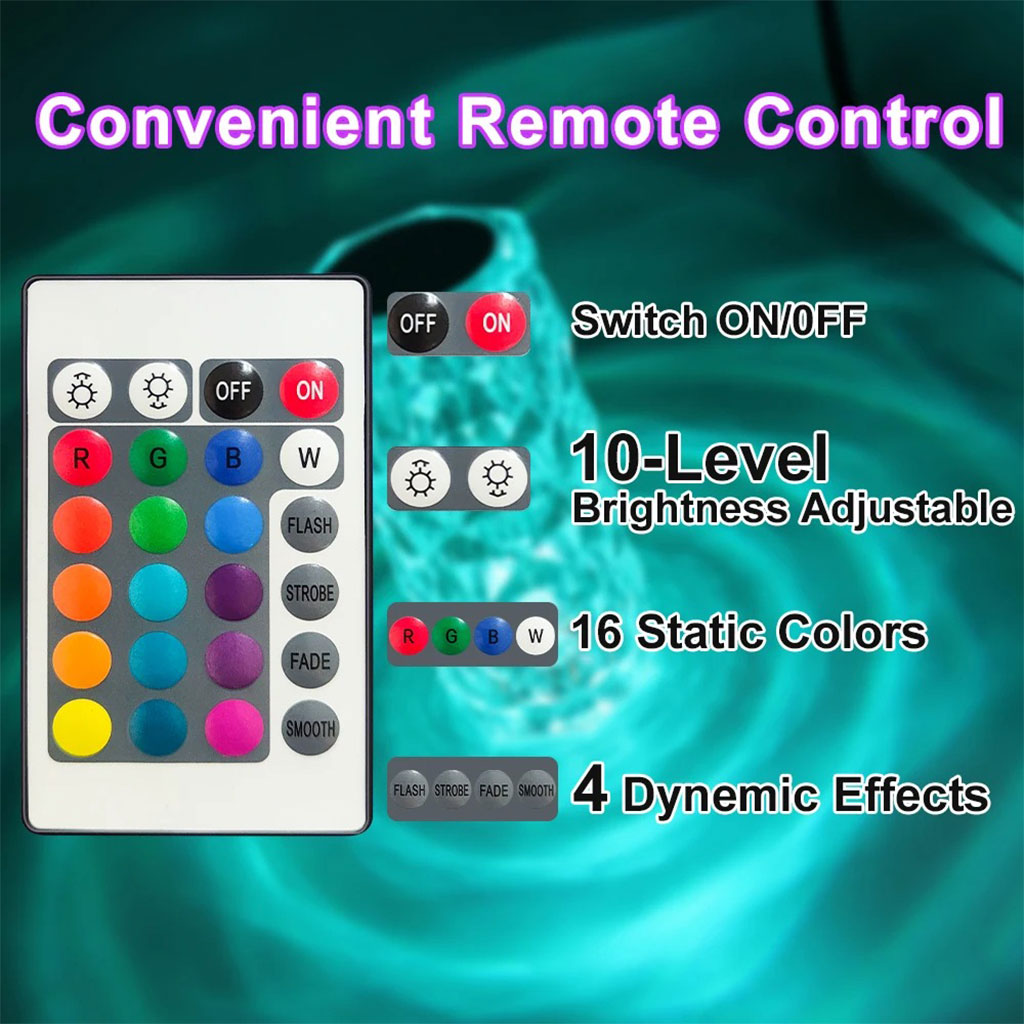 مصباح كريستال عالي الجودة مع تحكم باللمس والريموتمصنوع من الأكريليك عالي الجودة مع نفاذية ضوء أفضل ولمعان أجمل.تقنية إضاءة ثلاثية الأبعاد: عند التشغيل يلمع المصباح مثل الألماس ويضفي جوًا رومانسيًا.إضاءة RGB بـ 16 لون: التبديل بين الألوان باللمس أو باستخدام الريموت لتغيير الأجواء.بطارية قابلة للشحن (2000mAh): تعمل حتى 12 ساعة على الإضاءة المنخفضة أو 4 ساعات على الإضاءة العالية عبر منفذ USB-C.استخدامات متعددة: لغرف النوم، طاولات الطعام، المكاتب أو كهديّة مميزة للأصدقاء والعائلة.هدية مثالية: مناسبة للحفلات والمناسبات كإضاءة رومانسية أو كديكور فاخر.
