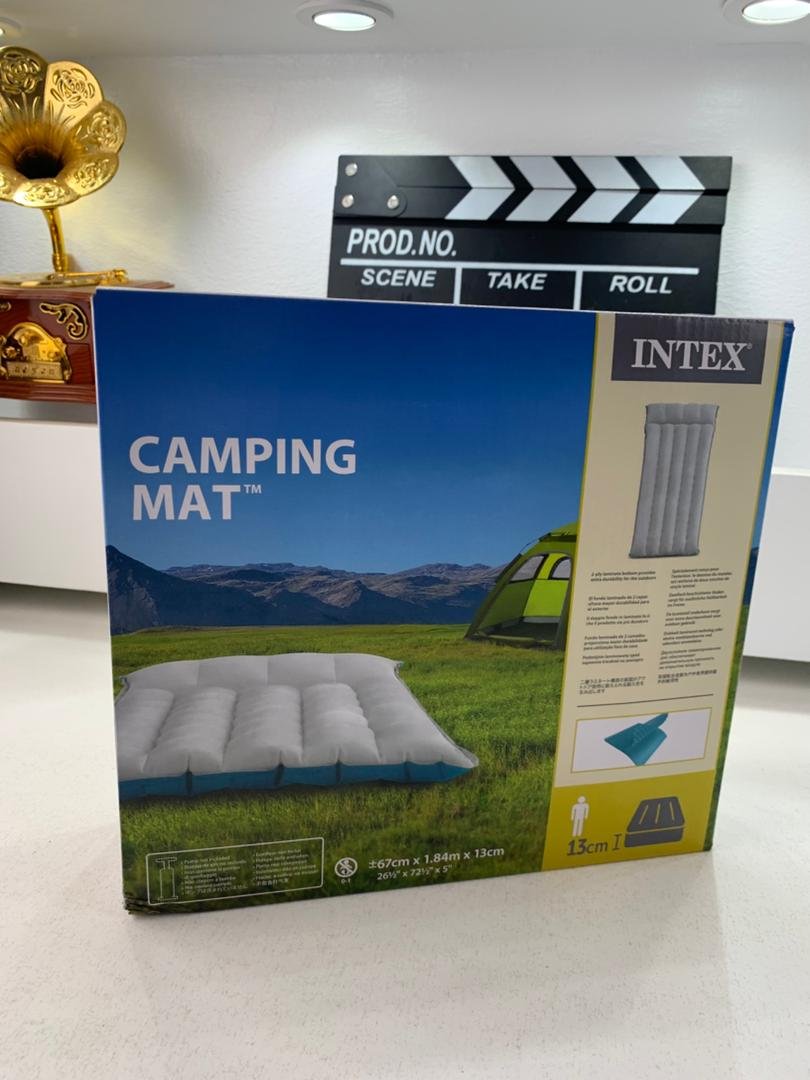 مرتبة هوائية للتخييم من Intexالخامة: 87٪ PVC، 10٪ بوليستر (PET)، 3٪ رايونالأبعاد: تقريبًا 72 × 189 × 20 سم (العرض × الطول × الارتفاع)تصميم مميز بطبقتين مقومتين، السطح أبيض والقاعدة زرقاءسطح مخملي مموج بتصميم 6 خطوط رأسية مع حواف مستديرة