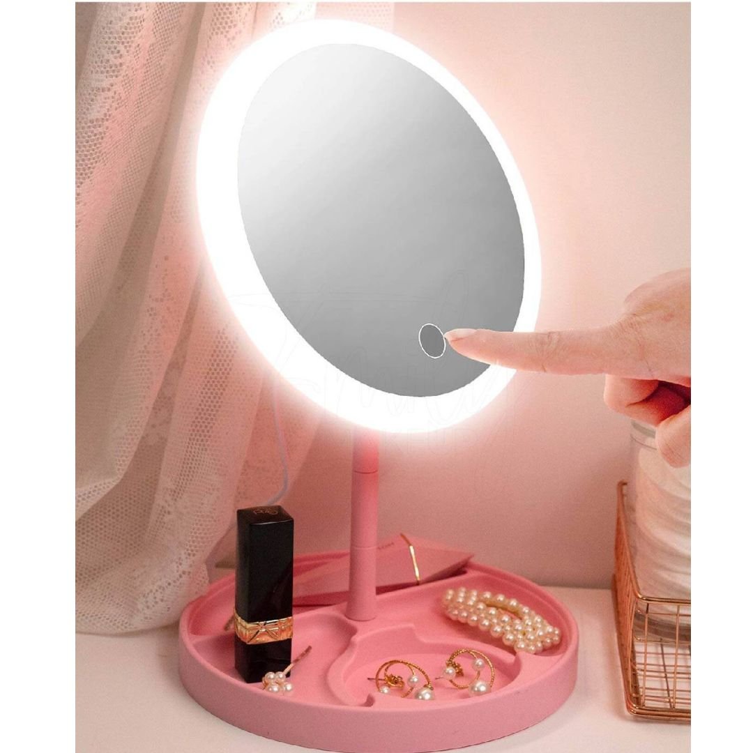 مرآة التجميل LED – مساعد المكياج لكل أنثىضوء طبيعي ناعمسطح مرآة عالي الدقةقاعدة تخزين مدمجةشحن عبر USB