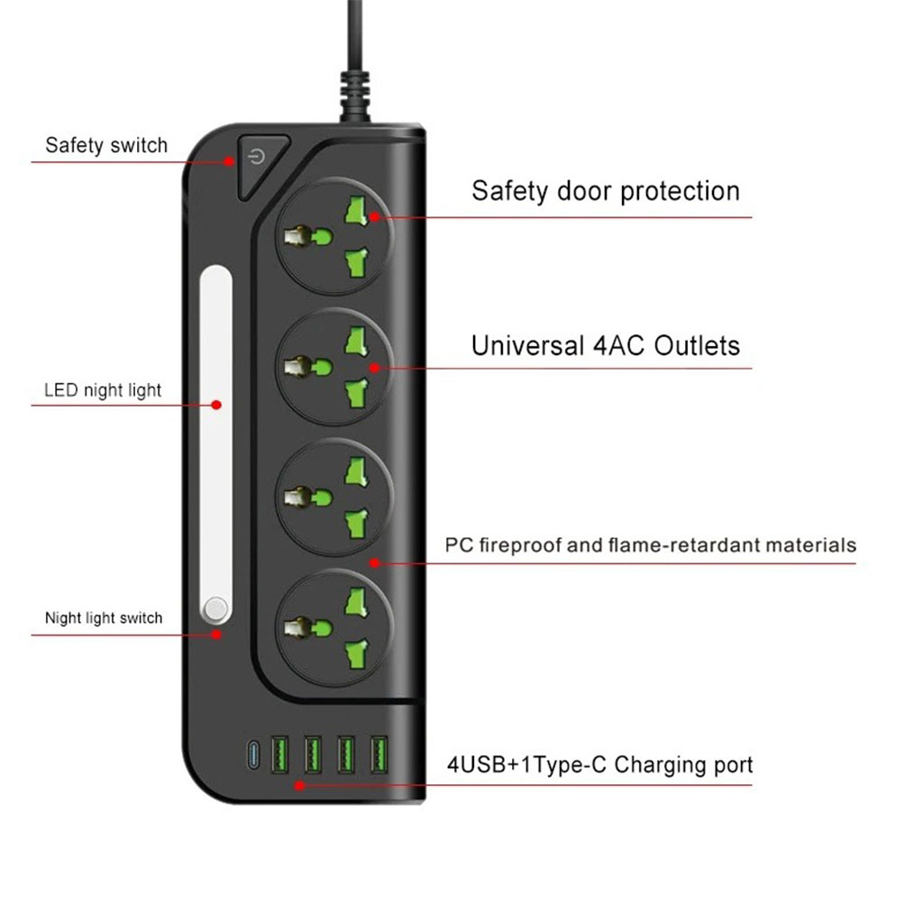 Multiprise 4 Sockets avec 4 Ports USB 1 Type-C 4000W Protection Surcharge et Lampe De Chevet – مقبس طاقة مع منافذ شحن