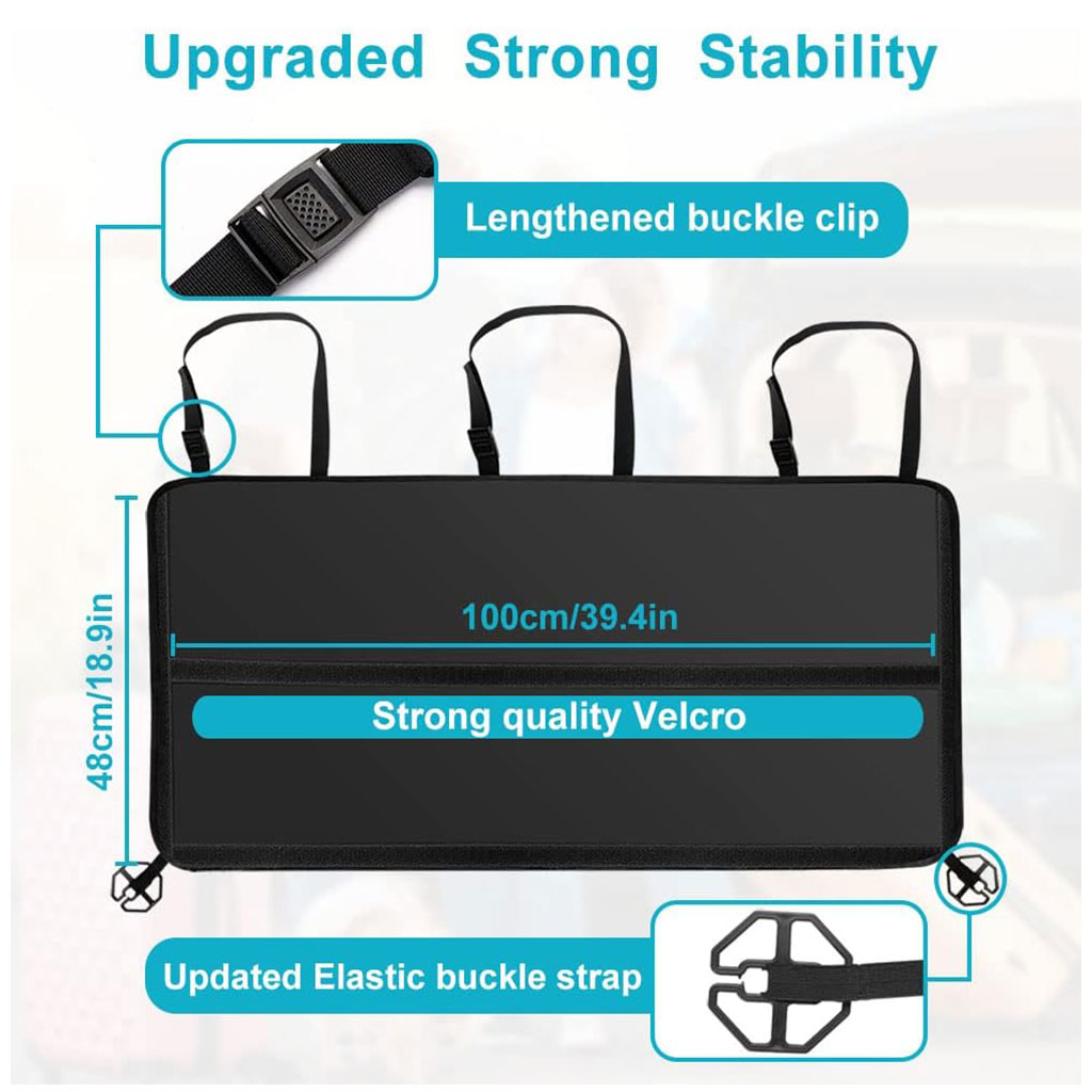 🚗 منظّم صندوق السيارة الذكي – حافظ على سيارتك مرتبة بأناقة وسهولة! 🧳قل وداعًا للفوضى داخل سيارتك مع هذا المنظّم العملي والمتين الذي يجمع بين التصميم الذكي، السعة الكبيرة، والاستقرار الفائق حتى أثناء القيادة السريعة أو على الطرق غير المستوية!💪 ثبات معزّز ثلاثي التقنيةنظام تثبيت ثلاثي: فيلكرو قوي + حزام علوي + حلقتان مطاطيتان محدثتان لثبات مثالي حتى عند حمل الأغراض الثقيلة.التصميم الجديد يمنع انزلاق المنظّم حتى على المقاعد الجلدية حيث لا يلتصق الفيلكرو عادةً.🧩 سعة تخزين كبيرة ومنظمةيحتوي على جيوب متعددة بأحجام مختلفة لتخزين الأدوات، القفازات، زجاجات المياه، الكتب والمزيد.جيب كبير مخفي بمقاس 45×30 سم مثالي لتخزين الأغراض الكبيرة مثل طفايات الحريق أو معدات السفر.🧼 خامة عالية الجودة وسهلة التنظيفمصنوع من قماش بوليستر PVC سميك ومتين مقاوم للتمزق والماء وخالٍ من الروائح.آمن للأطفال، قابل للغسل في الغسالة أو يمكن تنظيفه بسهولة بمنديل مبلل ليستعيد مظهره الجديد في ثوانٍ.🚙 مناسب لمعظم السياراتالأبعاد: 100 × 48 سم – يناسب أكثر من 95٪ من سيارات SUV، الميني فان، والصالون.مثالي للرحلات، التخييم، أو العائلات مع الأطفال لتنظيم الصندوق وتوفير مساحة إضافية.⚙️ تثبيت سريع بثلاث خطوات فقطثبّت المشابك الثلاثة القابلة للتعديل حول مساند الرأس.ثبت الفيلكرو خلف المقعد.أدخل الحلقات المطاطية الجانبية بين المقاعد.✨ منظّم Ezilif – الحل الذكي الذي يحافظ على سيارتك مرتبة دائمًا!