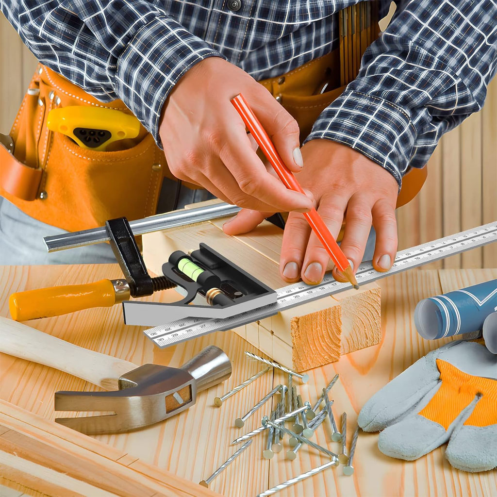 Outils de Menuiserie Carrée en Acier Inoxydable de 12’/300 mm, Règle de 45/90 Degrés avec Niveau à Bulle.