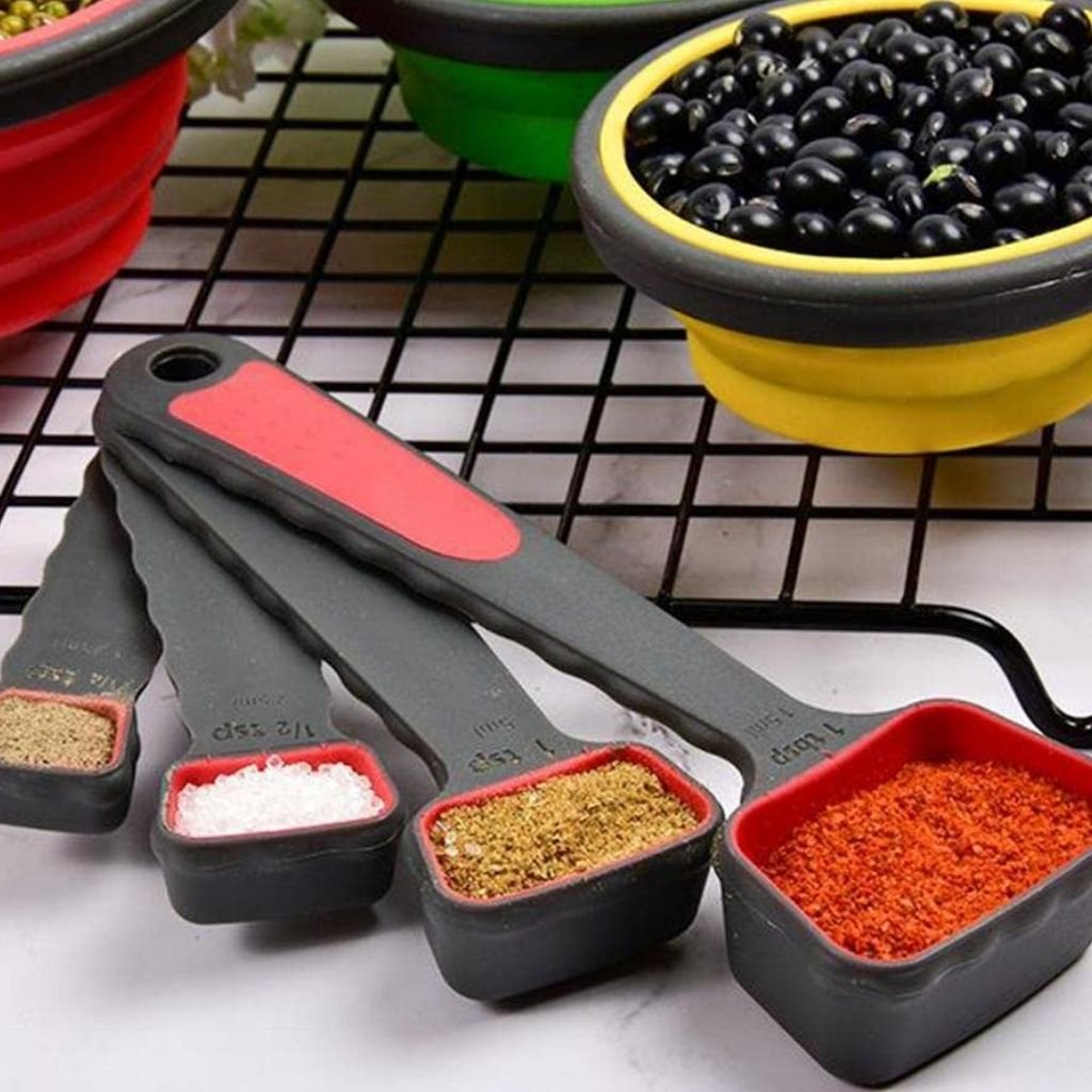 Ouvre-boîte Multifonction 4 en 1 et Cuillères à Mesurer Pliables en Silicone – فتاحة العلب متعددة الوظائف و ملاعق قياس قابلة للطي