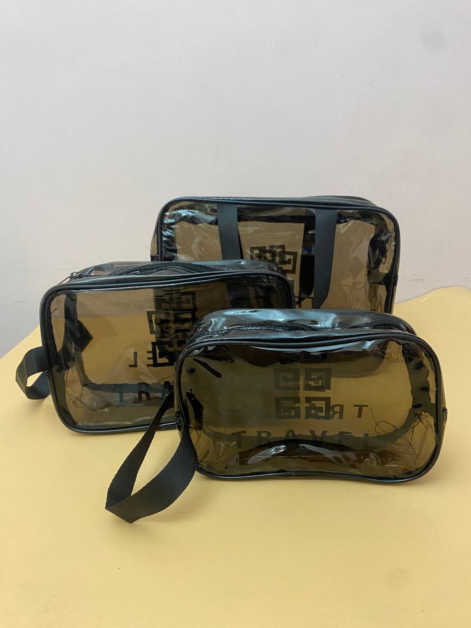 حقيبة الغسيل والسفر الشفافة – عملية وعصرية! ✨سعة كبيرة حقيبة واسعة تستوعب جميع مستحضرات التجميل وأدوات العناية الشخصية، مثالية للرحلات الطويلة.مقاومة للماء مصنوعة من نايلون مقاوم للماء لضمان بقاء أدواتك جافة حتى في الأجواء الرطبة.تصميم شفاف عملي يمكنك رؤية محتوى الحقيبة بسهولة لتجد منتجاتك المفضلة بسرعة.متعددة الاستخدامات لا تُستخدم فقط لمستحضرات التجميل، بل أيضًا لتخزين الملحقات الصغيرة مثل فرش الأسنان، الأمشاط أو إكسسوارات الشعر.مواصفات المنتج:الاسم: حقيبة غسيل/حقيبة مكياج للسفرالخامات: جلد PU + PVC مقاوم للماءالمقاسات:كبير: 30×12×21 سممتوسط: 27×10×17 سمصغير: 23×10×13 سم