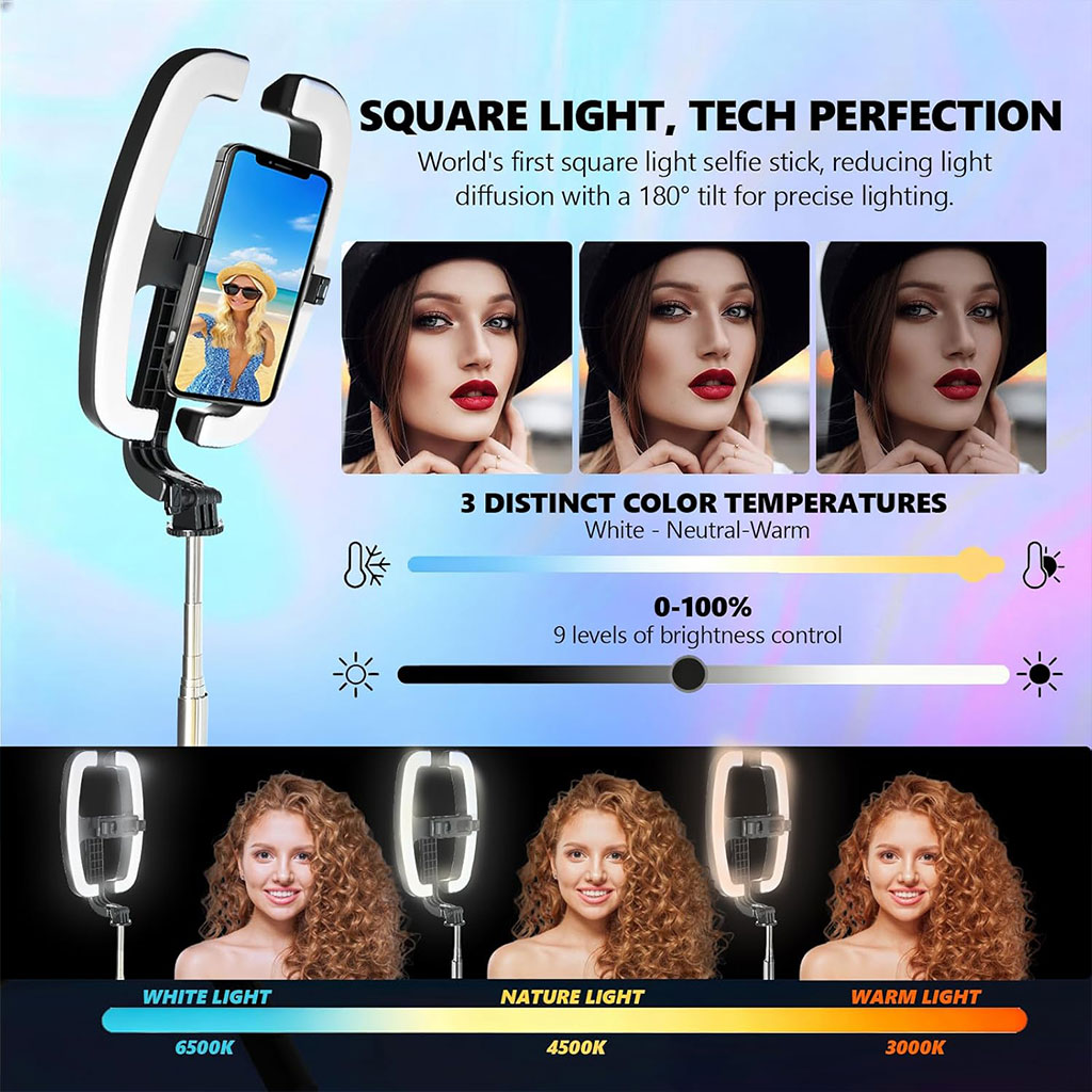 Perche à Selfie Extensible avec Support pour Téléphone et Lampe LED – عصا سيلفي مع إضاءة مدمجة ويد تحكم