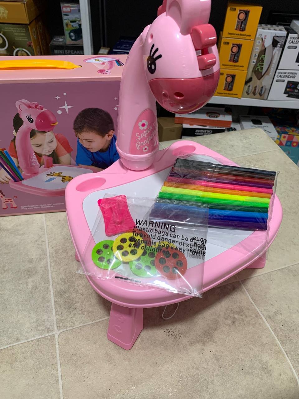 بروجكتور تعليمي موسيقي للأطفال للرسميسمح للأطفال بالرسم حسب الصور المسقطة على الطاولة أو دفتر الرسميتضمن 3 شرائح إسقاط (24 صورة متنوعة)مزود بالموسيقى لجذب الأطفال وتشجيعهم على البقاء لفترة أطول في اللعبيطور إدراك الألوان ويعزز الخيال وحب الرسميساعد الطفل على تنسيق حركة اليد والعين والعقلالمادة: بلاستيكيعمل بـ 3 بطاريات AA (غير مشمولة)الألوان والحجم حسب الصور المرفقة