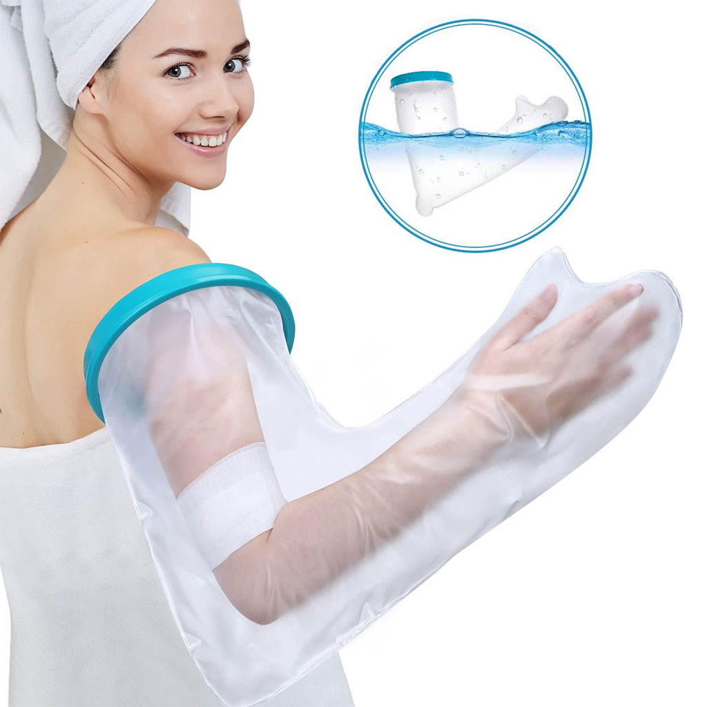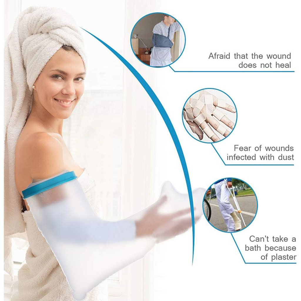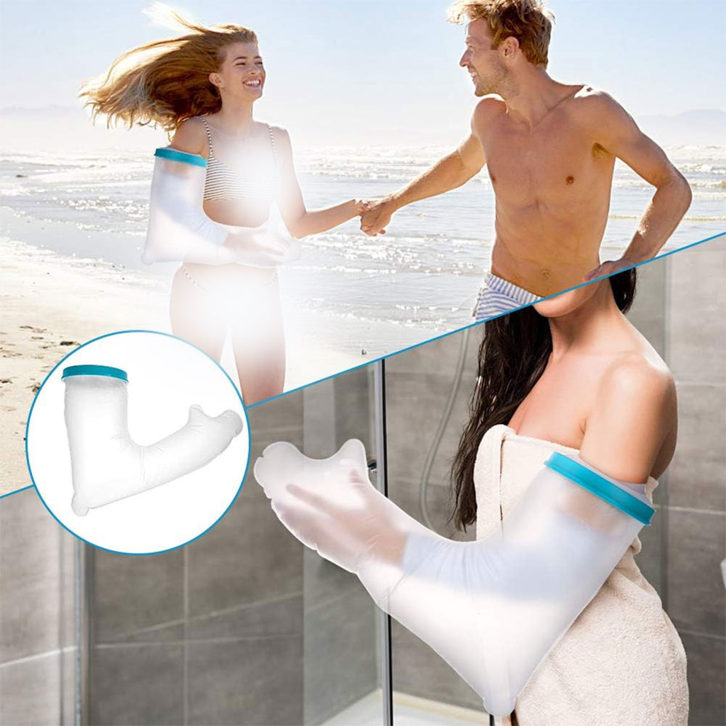غطاء واقٍ للجبيرة / الجص للذراع – مقاوم للماء وخفيف الوزن🔹 غطاء ذراع خفيف الوزن : كان المطاط في الطراز القديم يترك آثارًا على الجلد بسهولة. أما الغطاء الجديد المقاوم للماء فهو مصنوع من مطاط أكثر مرونة لا يترك أي أثر على البشرة ولا يلتصق بها. الغشاء المرن والمحكم الإغلاق لا يعيق الدورة الدموية.🔹 حماية فعالة ضد تسرب الماء : مثالي للاستحمام والاغتسال، وخصوصًا للأشخاص الذين يتعافون من عملية جراحية أو يعانون من مشاكل جلدية. يحمي المنطقة المصابة من البلل. يُوصى به أثناء الاستحمام أو الأنشطة الخارجية بعد إصابة، عملية جراحية، حادث، أو في حالات مثل الطفح الجلدي، الحروق، مشاكل الجلد أو الجروح.🔹 غطاء جبيرة مقاوم للماء للذراع : بطول 60 سم، يغطي الذراع بالكامل، مما يجعله مثاليًا لحماية الأصابع والذراع. مصنوع من مادة خفيفة، صحية وقابلة للغسل، لا تلتصق بالذراع. الفتحة المركزية المرنة، التي يمكن أن تمتد حتى 15 سم قطرًا، واسعة بما يكفي لمرور الجبيرة، وفي الوقت نفسه محكمة بما يكفي لمنع تسرب الماء.🔹 صديق للبيئة وآمن : الغشاء مصنوع من سيليكون طبي عالي الجودة، والكم من PVC، وهو مادة مانعة للانزلاق لا تلتصق بالذراع. خالٍ من اللاتكس، عديم الرائحة والطعم، سهل الغسل. الفتحة المرنة الناعمة تجعل ارتداءه وخلعه سهلاً وغير مؤلم.📏 الأبعاد : 60 × 15 سم