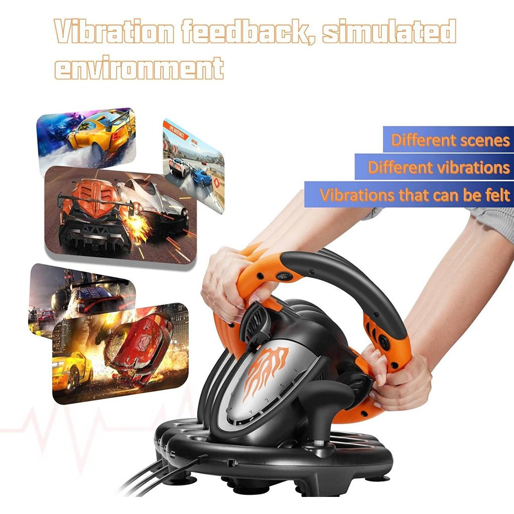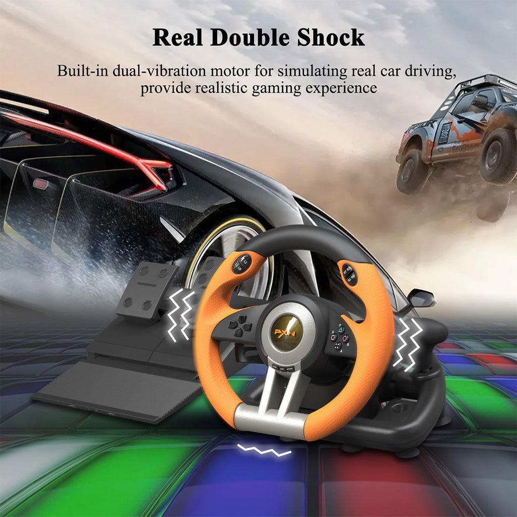 🏎️ عجلة قيادة الألعاب PXN V3 – متوافقة مع 6 منصاتتوافق شامل: تعمل على PC، PS3، PS4، Xbox One، Xbox Series X/S، Switch، وأنظمة Windows 7/8/10/11.متعة بلا حدود: مثالية لألعاب مثل Forza Horizon، Need for Speed، F1، Mario Kart، وغيرها.تحكم واقعي: دواسات مريحة وسريعة الاستجابة، تصميم مانع للانزلاق، مع إمكانية التبديل بين وضعي X و D.تصميم قوي: مصنوعة من ABS عالي الجودة مع مشابك قوية لتثبيت مثالي على المكتب.