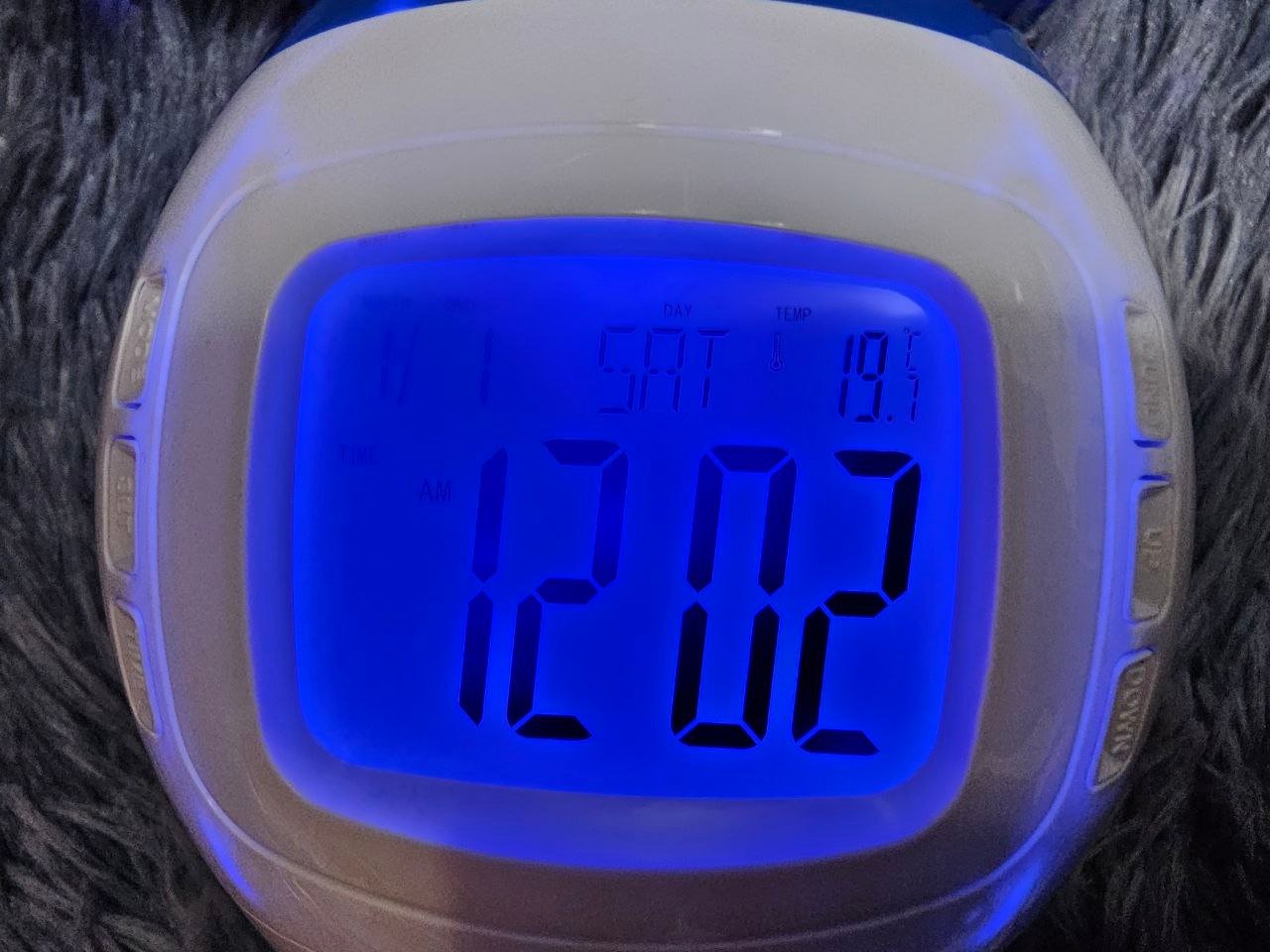 ساعة منبّه مع عرض التاريخ وحرارة وإسقاط نجومتعرض الوقت، الأسبوع، التاريخ، الشهر، السنة ودرجة الحرارة.مقياس حرارة بالدرجتين المئوية والفهرنهايت (0°-50°C / 32°-122°F).نظام 12/24 ساعة مع منبّه وأصوات طبيعية وخاصية الغفوة.مؤقت عدّ تنازلي (00:00:00 – 23:59:59).وضع عرض موسيقي مع إسقاط ديناميكي للنجوم والقمر يتفاعل مع الصوت.مزودة بخاصية الإضاءة الخلفية. المواصفات:الخامة: ABSالحجم: 10.4×10.2×8.2 سماللون: أبيض + أزرقالوزن: 200 جم تقريباًتعمل بثلاث بطاريات AAA (غير مرفقة)لون الإضاءة: متعدد الألوان المرفقات: ساعة منبّه إسقاطية + دليل باللغة الإنجليزية.