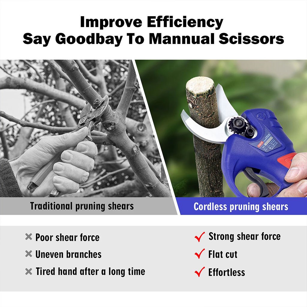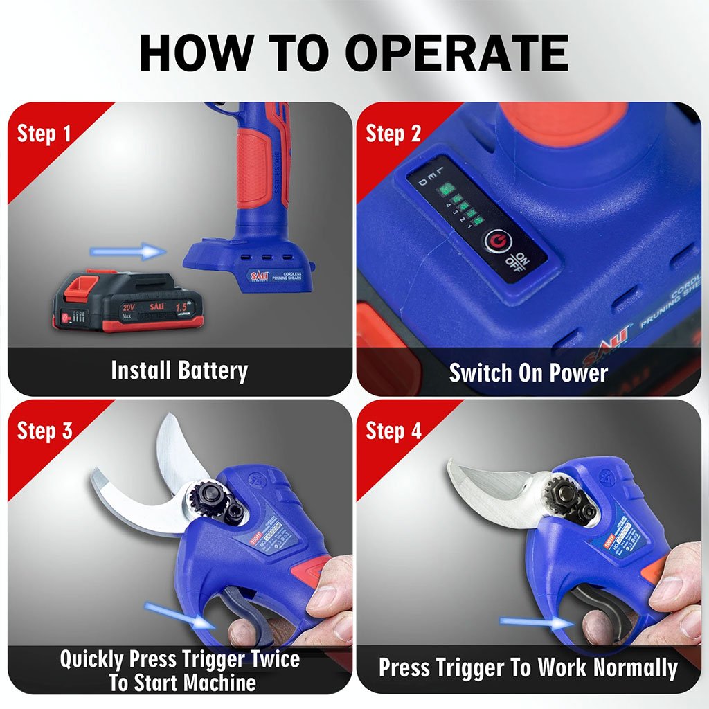 مقص كهربائي لاسلكي – Sallyشفرة من فولاذ كربوني SK5 عالية الجودة مع محرك بدون فُرش لمزيد من القوة وكفاءة قطع عالية.فتحة الشفرة قابلة للتعديل بين 15 مم و30 مم لتلبية مختلف احتياجات القطع.بطاريتان ليثيوم 20V 1.5Ah طويلتا العمر مع حماية من الحمل الزائد والحرارة.مفتاح أمان مزدوج التشغيل لمنع التشغيل العرضي.تصميم مريح مقاوم للصدمات والانزلاق، مناسب للعمل الطويل دون تعب.كفاءة أعلى 8-10 مرات من المقص اليدوي.مناسب لاستخدامات متعددة: الحدائق، المزارع، البيوت المحمية، قطع العنب والتفاح والكرز.محتويات العبوة: مقص كهربائي ×1، بطارية ×2، شاحن ×1، زيت تشحيم ×1، أدوات تثبيت ×2، صندوق تخزين محمول ×1.كيف تستعمل: