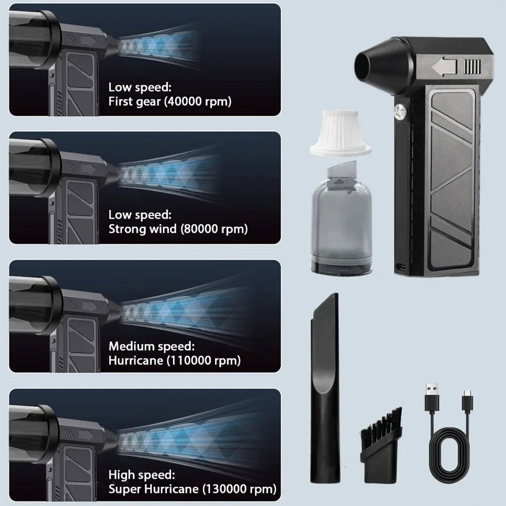 ⚡️ مروحة توربو محمولة فائقة القوة 130000 دورة/دقيقةقوة رياح خارقة: مزودة بمحرك بدون فُرش يعمل بسرعات عالية تصل إلى 130000 دورة في الدقيقة، ما يمنحك تدفق هواء قوي ومباشر في كل لحظة.أربع سرعات للتحكم الكامل:السرعة الأولى (بطيئة) : 40000 دورة/دقيقةالسرعة الثانية (متوسطة) : 80000 دورة/دقيقةالسرعة الثالثة (عاصفة) : 110000 دورة/دقيقةالسرعة الرابعة (إعصار فائق) : 130000 دورة/دقيقةتصميم بإضاءة مدمجة: تحتوي المروحة على أضواء LED ساطعة تُمكّنك من استخدامها حتى في الظلام، مثالية لتنظيف الزوايا أو للاستعمال في المخيمات ليلاً.محمولة وخفيفة الوزن: بفضل حجمها الصغير وتصميمها المدمج، يمكنك حملها بسهولة أينما ذهبت. مثالية للاستخدام داخل السيارة، في السفر، أو في الهواء الطلق.شاشة رقمية ذكية: تعرض مستوى السرعة وشحن البطارية بوضوح. تحتوي على بطاريتين مدمجتين قوية تسمحان بالاستخدام اللاسلكي دون الحاجة إلى مصدر كهرباء مباشر، لتجربة مريحة تدوم طويلاً.هيكل عالي الجودة وشحن سريع: تصميم أنيق ومتين بهيكل محمول وخفيف. مزودة بمنفذ شحن Type-C سريع، يُسهّل إعادة الشحن بشكل آمن وسريع.سهولة في الاستخدام وأمان تام: مزودة بأربع مستويات سرعة مع مؤشرات ضوئية، وتصميم مريح لسهولة الحمل والاستخدام بيد واحدة. كما تحتوي على نظام حماية ذكي ضد الشحن الزائد وارتفاع الحرارة، لضمان الاستخدام الآمن.