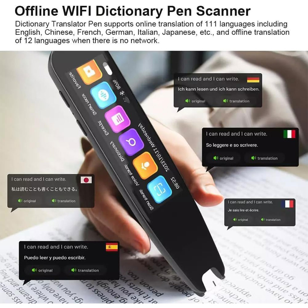 معدل تعرف مرتفع: قلم الترجمة الصوتي يدعم المسح الضوئي والترجمة المتبادلة لـ 12 لغة سواءً عبر الإنترنت أو دون اتصال، مع معدل دقة للمسح يصل إلى 99%. يمكنك الحصول على ترجمة احترافية تنقل المعنى الكامل للنص الأصلي.134 ترجمة صوتية: القلم الذكي للترجمة يدعم 134 نوعًا من الترجمات الصوتية عند الاتصال بالشبكة، حيث يمكن لـ 133 لغة إخراج الصوت وعرض النص بعد الترجمة، بينما لغة واحدة تعرض النص فقط بعد الترجمة.استخراج النصوص: يأتي القلم مزودًا بتقنية ترجمة صوتية مكتبية تعمل دون اتصال، مما يتيح حفظ البيانات النصية داخله عبر المسح الضوئي، ويدعم استخراج النصوص بـ 21 لغة.ميزة التسجيل: تسجيل مزدوج الميكروفون مع فك ترميز عالي الدقة وتقنية تقليل الضوضاء. يدعم الاتصال بأجهزة البلوتوث، وضبط السطوع، وضبط المنطقة الزمنية، وضبط وقت الإيقاف التلقائي، وسرعة القراءة بعد الترجمة.قاموس إلكتروني: يدعم قاموس صيني-إنجليزي، إنجليزي-صيني، إنجليزي-ياباني، القاموس الصيني، قاموس الأمثال، شعر أسرة تانغ، بالإضافة إلى كتاب كلمات يحتوي على مفردات خاصة بالمدرسة، الثانوية، الجامعة، امتحانات IELTS وTOEFL وSAT وGRE. شاشة: 3.5 بوصة. الأبعاد: 148×45×13.5 مم.