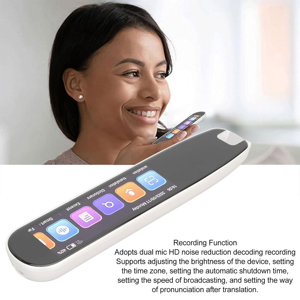 معدل تعرف مرتفع: قلم الترجمة الصوتي يدعم المسح الضوئي والترجمة المتبادلة لـ 12 لغة سواءً عبر الإنترنت أو دون اتصال، مع معدل دقة للمسح يصل إلى 99%. يمكنك الحصول على ترجمة احترافية تنقل المعنى الكامل للنص الأصلي.134 ترجمة صوتية: القلم الذكي للترجمة يدعم 134 نوعًا من الترجمات الصوتية عند الاتصال بالشبكة، حيث يمكن لـ 133 لغة إخراج الصوت وعرض النص بعد الترجمة، بينما لغة واحدة تعرض النص فقط بعد الترجمة.استخراج النصوص: يأتي القلم مزودًا بتقنية ترجمة صوتية مكتبية تعمل دون اتصال، مما يتيح حفظ البيانات النصية داخله عبر المسح الضوئي، ويدعم استخراج النصوص بـ 21 لغة.ميزة التسجيل: تسجيل مزدوج الميكروفون مع فك ترميز عالي الدقة وتقنية تقليل الضوضاء. يدعم الاتصال بأجهزة البلوتوث، وضبط السطوع، وضبط المنطقة الزمنية، وضبط وقت الإيقاف التلقائي، وسرعة القراءة بعد الترجمة.قاموس إلكتروني: يدعم قاموس صيني-إنجليزي، إنجليزي-صيني، إنجليزي-ياباني، القاموس الصيني، قاموس الأمثال، شعر أسرة تانغ، بالإضافة إلى كتاب كلمات يحتوي على مفردات خاصة بالمدرسة، الثانوية، الجامعة، امتحانات IELTS وTOEFL وSAT وGRE. شاشة: 3.5 بوصة. الأبعاد: 148×45×13.5 مم.