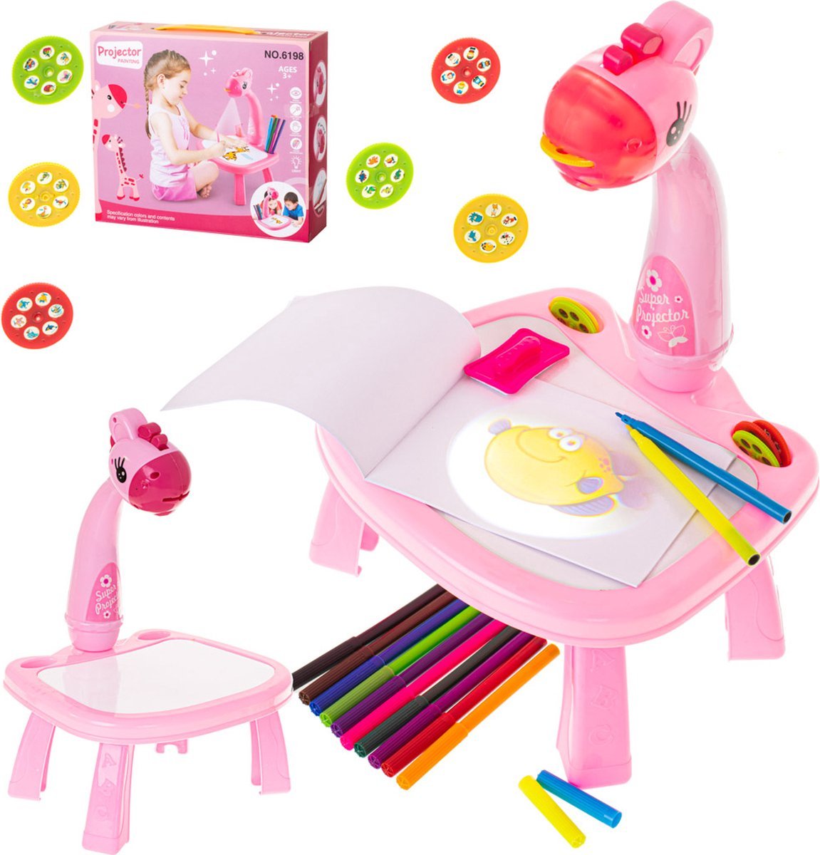 بروجكتور أطفال بتصميم زرافة للرسم والتلوينألوان مشرقة ودافئة تجذب الطفل لساعات من اللعب الإبداعييعمل بثلاث بطاريات AA (غير مشمولة)يتضمن 6 شرائح بعدسات إسقاط تحتوي على 36 صورة مختلفةيمكن الرسم مباشرة على طاولة البروجكتور ومسح الصور بالإسفنجة المرفقةيحسّن مهارة اليد والأصابع ويعزز الخيال والإبداعيمكن عرض الرسومات النهائية على ورق خارجي أو تعليقها كديكورالمحتويات:طاولة مزودة ببروجكتور6 شرائح عرضإسفنجةدفتر رسم12 قلم تلوينمادة الصنع: بلاستيكالعمر المناسب: ‎3 سنوات فأكثرالأبعاد: 25×21×35 سم (ارتفاع المنصة 13 سم)