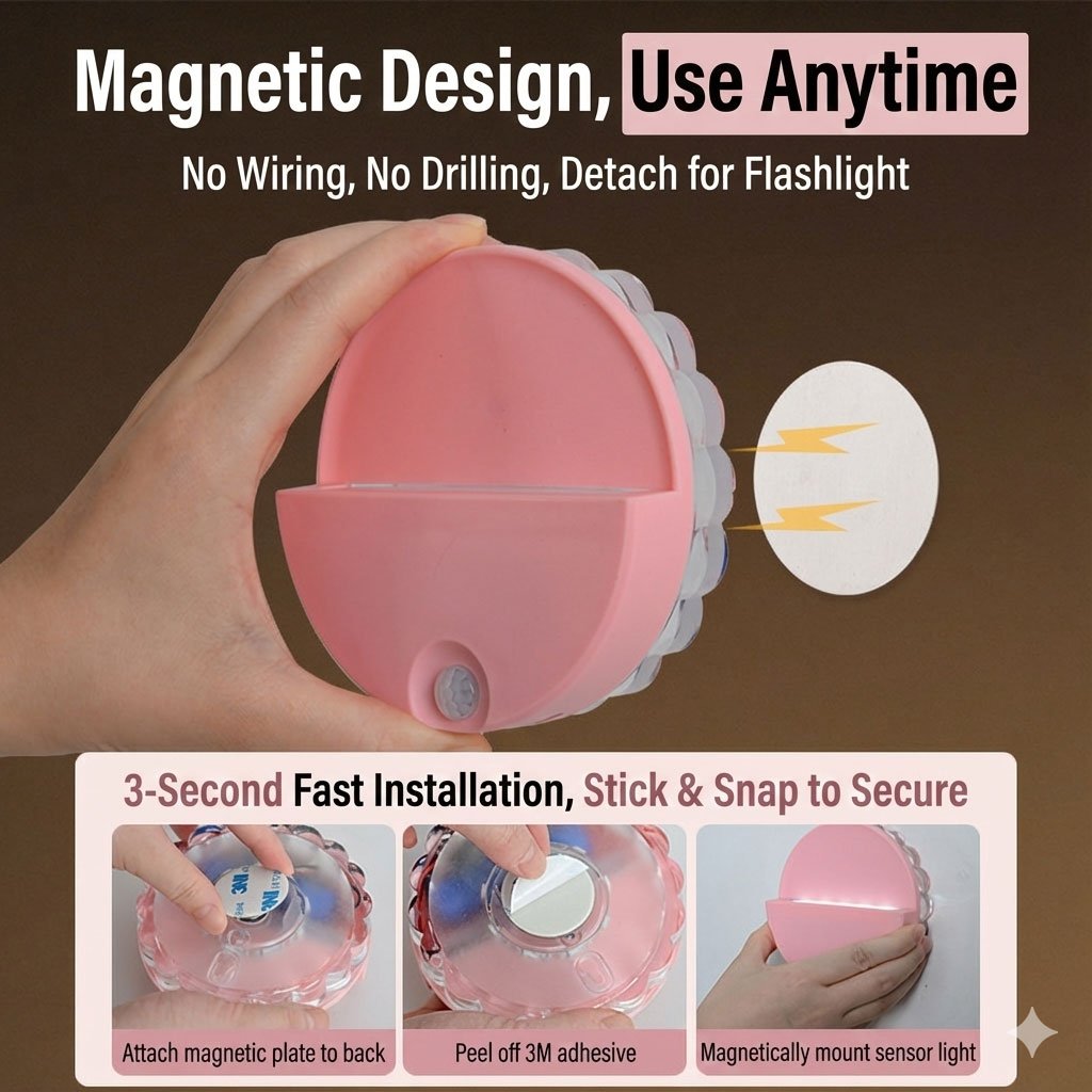 💡✨ مصباح ليلي ذكي مغناطيسي بتصميم كريستالي ✨💡🔧 تركيب فوري بدون أدوات بفضل نظام Stick & Snap يمكنك تثبيت المصباح في 3 ثوانٍ فقط ⏱️ ✔️ لاصق 3M قوي ✔️ بدون حفر أو أسلاك ✔️ لا يترك أي أثر على الجدران 🧱🧲 تصميم مغناطيسي 2 في 1 مزود بقاعدة مغناطيسية قوية تسمح بفصله بسهولة ✋ 👉 استخدمه كمصباح حائط ثابت 👉 أو كمصباح يدوي محمول للتنقل بأمان ليلاً 🌙👣 استشعار حركة ذكي حساس دقيق يضيء المصباح تلقائيًا عند اكتشاف الحركة في الظلام ✔️ إضاءة بدون لمس ✔️ توفير في الطاقة 🔋💎 تصميم أنيق بلمسة كريستالية لون وردي ناعم مع حواف محفورة بتأثير الكريستال ✨ ليس مجرد إضاءة، بل قطعة ديكور راقية مثالي لغرفة الأطفال 👶، غرفة الملابس 👗، أو المداخل 🚪🛡️ متعدد الاستعمالات وآمن إضاءة لطيفة لا تؤذي العين 👀 مثالي للإرشاد الليلي بدون إبهار حل ممتاز للمستأجرين أو الأماكن بدون مقابس كهرباء مثل: داخل الخزائن، الأدراج، السلالم 🪜🌈 ألوان RGB متعددة 📐 الأبعاد: 9 × 9 سم✨ إضاءة ذكية… أناقة، أمان، وسهولة في كل مكان!